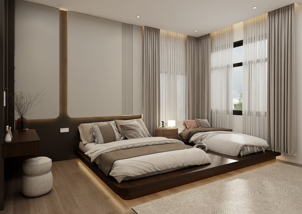 A serene, multi-generational retreat featuring a floating timber platform and integrated fluted wall panels. Earthy tones and soft ambient cove lighting enhance the architectural depth, creating a cohesive, tranquil sanctuary that prioritizes spatial flow and understated luxury.