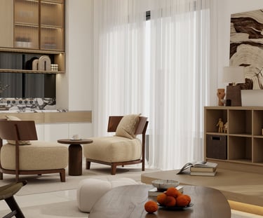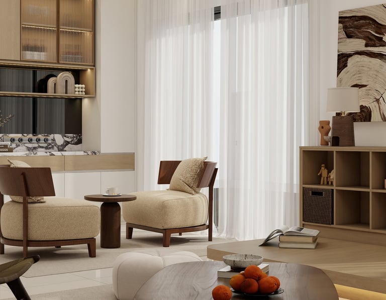 Curated soft-minimalism meets organic warmth. Low-profile, curved timber furniture and plush dual-toned seating anchor the space, while tactile fabrics and seamless oak joinery evoke tranquility. Architectural track lighting and natural accents complete this elevated, serene sanctuary.