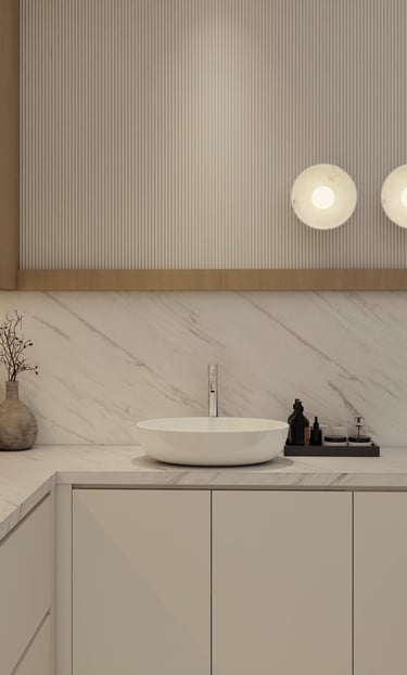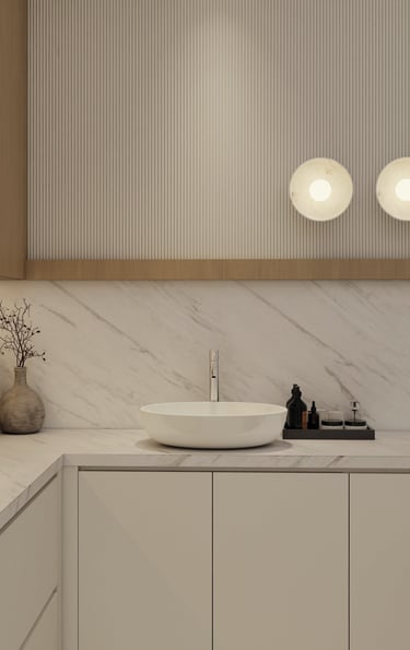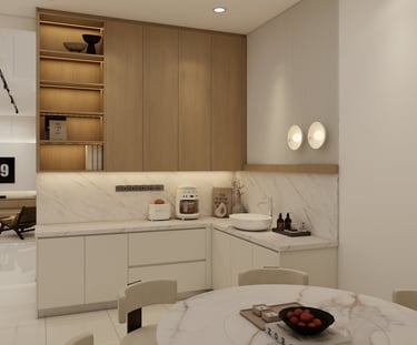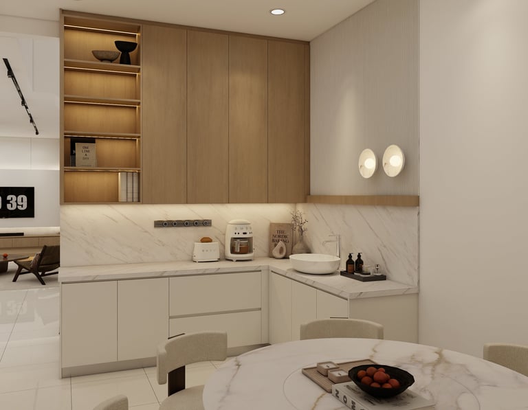 Experience a refined culinary space where warm oak joinery meets elegant marble surfaces. Fluted wall details and integrated LED shelving create a layered, atmospheric glow, while minimalist cabinetry ensures a seamless transition between functional storage and modern design.