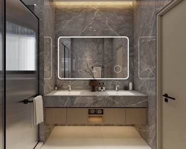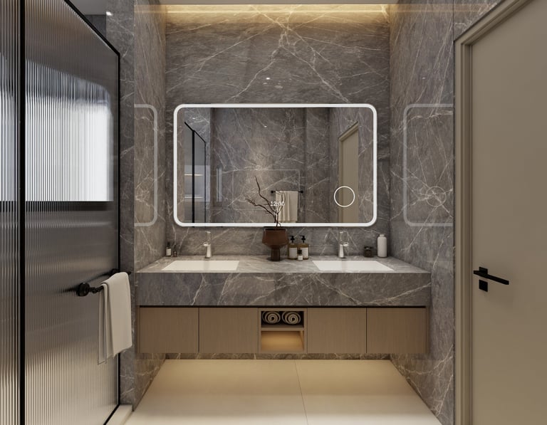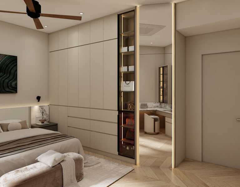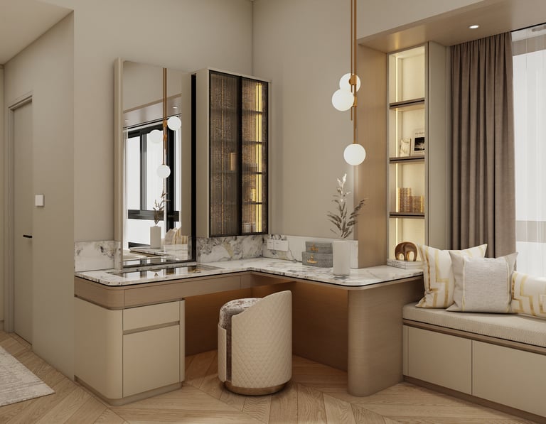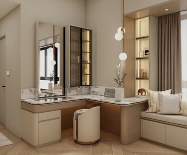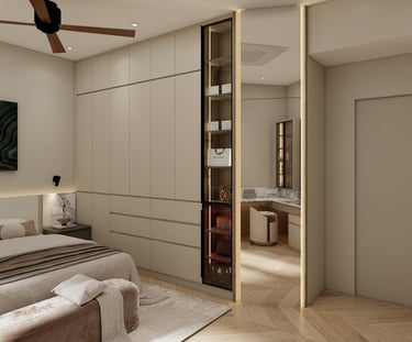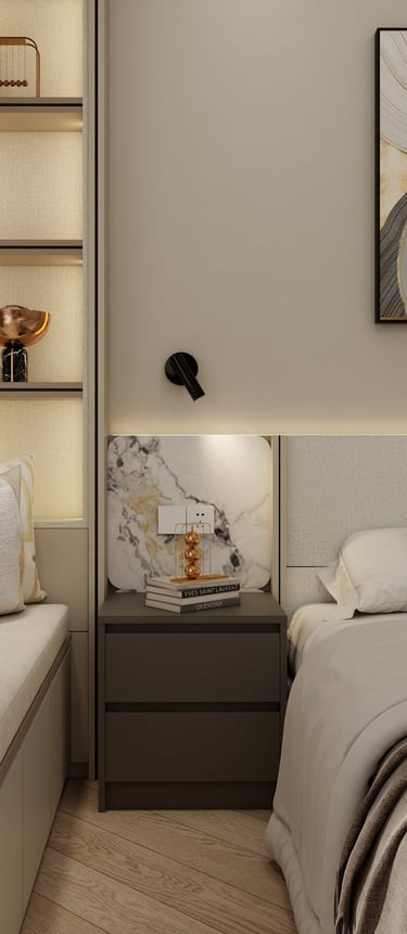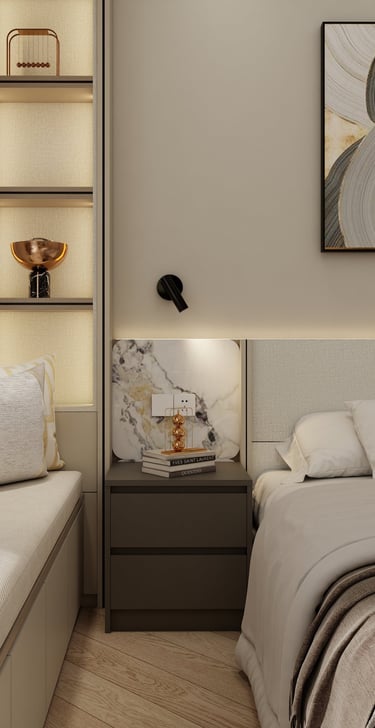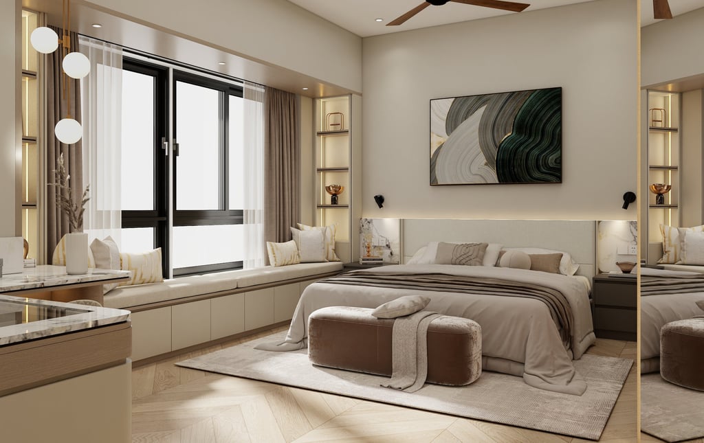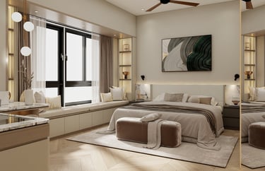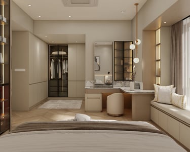 A master suite defined by sculptural serenity and tonal warmth. This design marries clean-lined minimalism with organic textures, featuring a bespoke window lounge, integrated marble accents, and soft ambient lighting to create a refined, high-end sanctuary for rest.