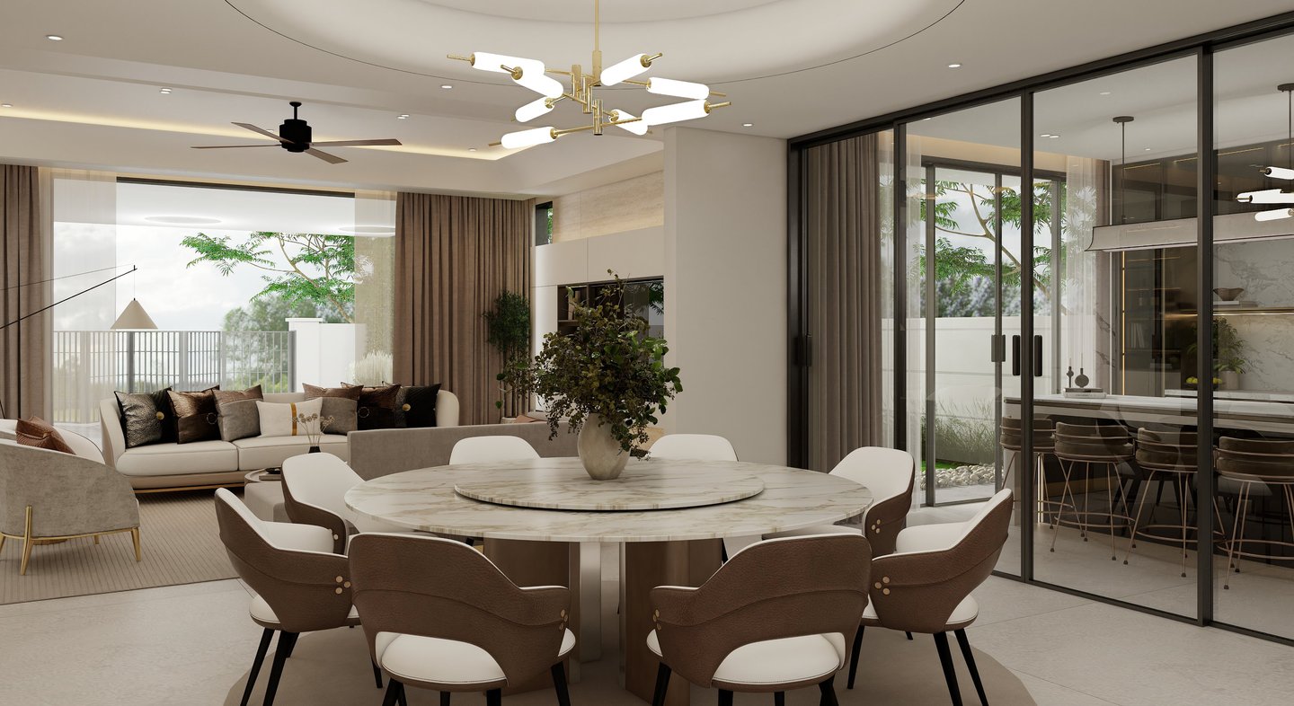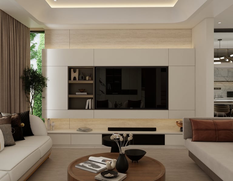 Built-in cabinetry and concealed storage maintain visual clarity while subtle lighting highlights material textures. Curved furniture elements soften the structured layout, resulting in a balanced living space that blends contemporary elegance with everyday comfort and quiet sophistication.