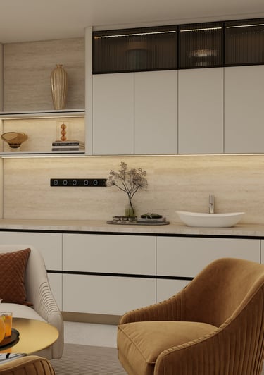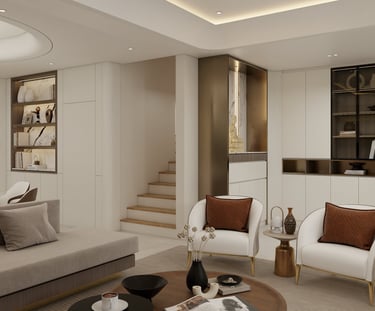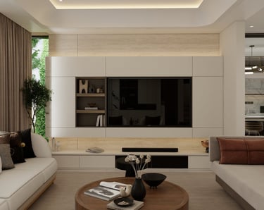This project explores a warm minimalist concept where clean architectural lines meet soft natural textures. A neutral palette of beige, cream, and warm wood creates a calm and welcoming atmosphere.