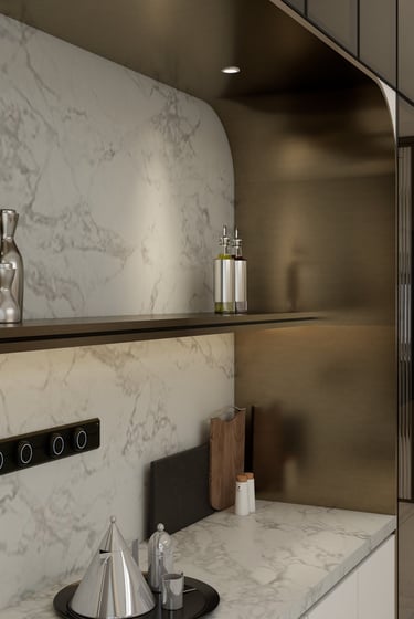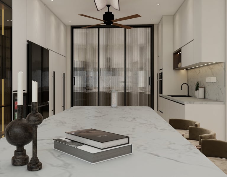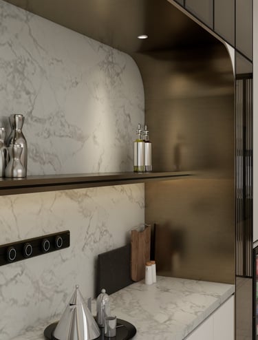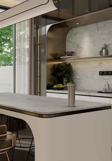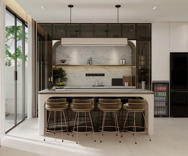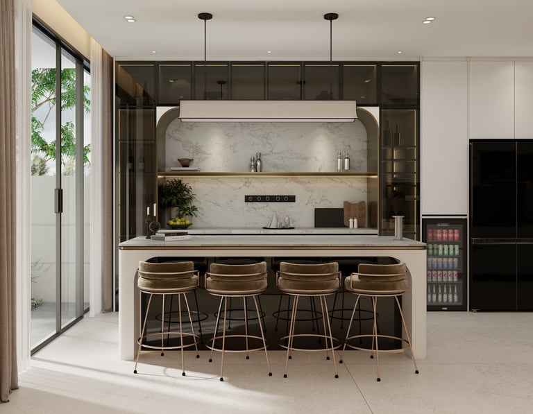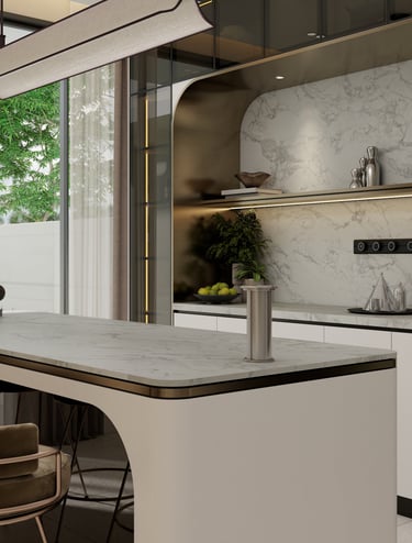 This kitchen embraces a modern luxury aesthetic defined by clean lines, marble textures, and warm metallic accents. A central island encourages social interaction, while glass cabinetry and layered lighting create depth, elegance, and a refined yet welcoming culinary space.